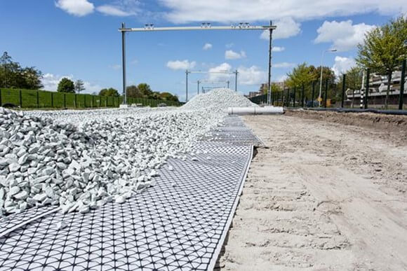Lớp nền đường sắt đang được lắp đặt lưới địa kỹ thuật phức hợp Tensar TX190L-GN (lưới kết hợp vải địa kỹ thuật không dệt phân cách) để ổn định lớp đá ba lát trên nền đất yếu.