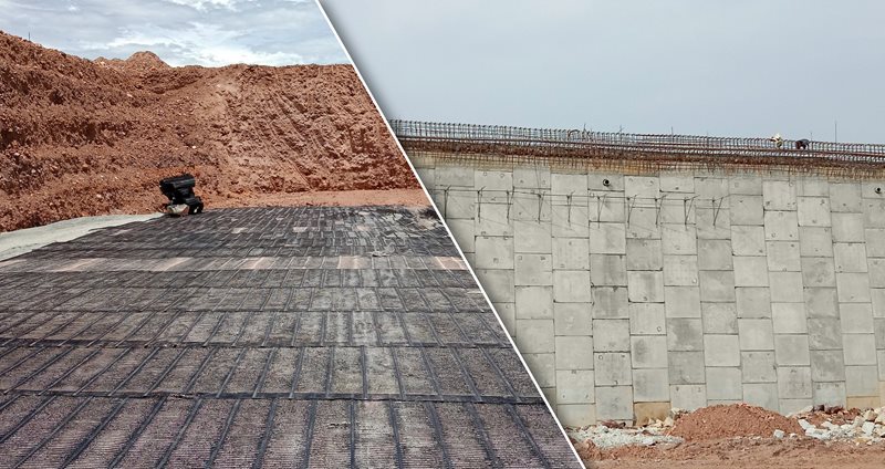 Kết cấu tường chắn có cốt với bề mặt bê tông đúc sẵn đã được xây dựng để trở thành đường dẫn đầu cầu cho Cầu Khải Định, Tỉnh Thừa Thiên Huế, Việt Nam. Lưới địa kỹ thuật dòng RE500 được sử dụng cho kết cấu tường chắn Panel thay vì sử dụng cốt gia cường dải thép.